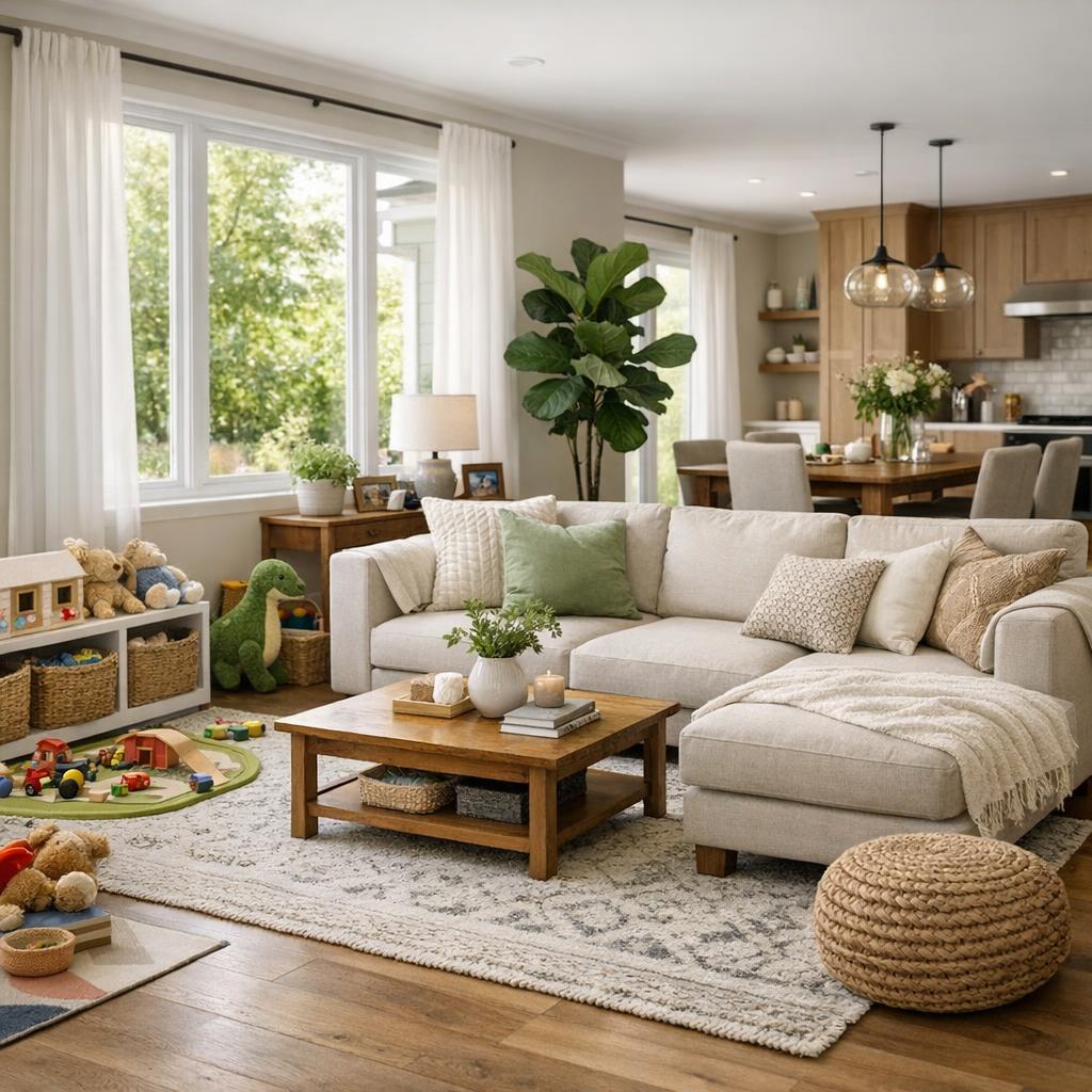 Praktische Elemente wie ein großer Couchtisch mit Stauraum oder Regale für Spiele und Bücher erleichtern den Alltag. Eine gut durchdachte Medienecke sorgt für Unterhaltung, ohne den Raum zu überladen. Accessoires wie Kissen und Decken schaffen eine warme Atmosphäre.